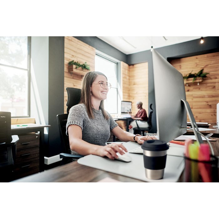 Einwandiger Trinkbecher aus Edelstahl mit Griffteil und Deckel aus Silikon. Füllmenge: 350 ml. Da der einwandige Becher die Hitze nach Außen leiten kann, kann der Artikel heiß werden.