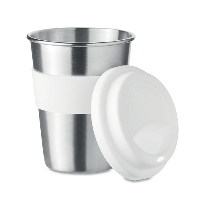 Einwandiger Trinkbecher aus Edelstahl mit Griffteil und Deckel aus Silikon. Füllmenge: 350 ml. Da der einwandige Becher die Hitze nach Außen leiten kann, kann der Artikel heiß werden.