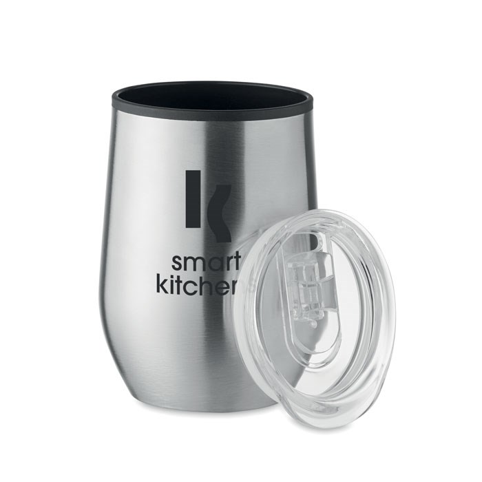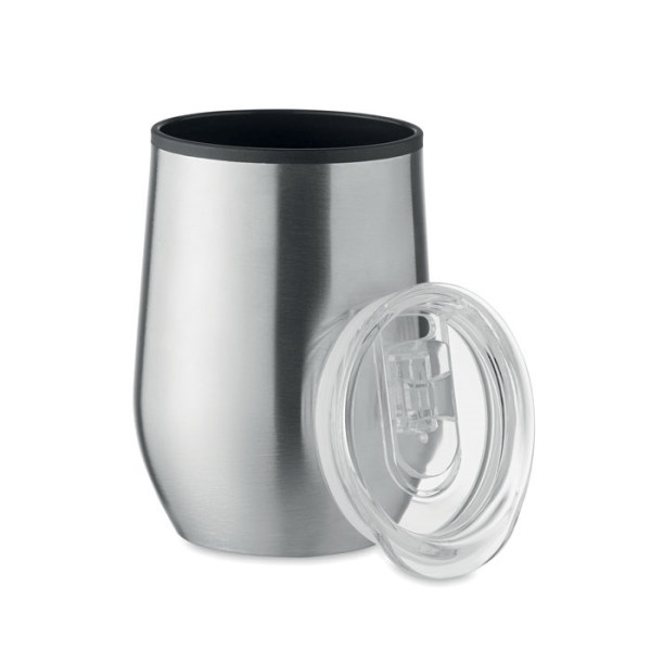 Doppelwandiger Trinkbecher aus Edelstahl mit PP-Innenseite und transparentem PS-Deckel. Füllmenge: 350 ml.