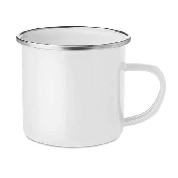Emaillierter Metall-Becher im Vintage-Look. Spezielle Beschichtung für Sublimationsdruck. Füllmenge: 350 ml.