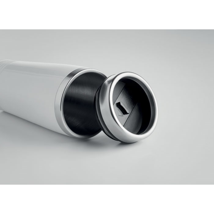 Doppelwandiger Trinkbecher aus Edelstahl mit schwarzem PP-Deckel. Füllmenge: 400 ml.