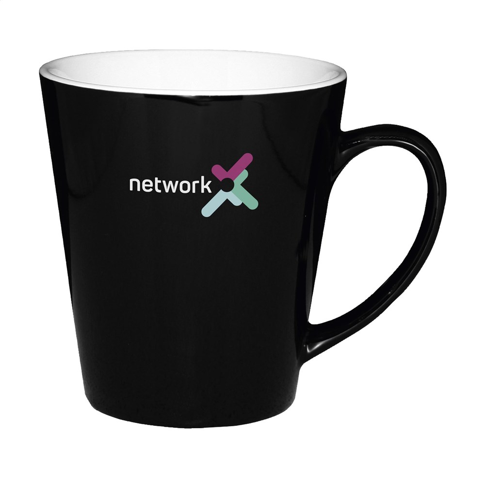 Zeitgenössische Qualitätstasse aus Keramik. Komplett in weiß oder mit farbiger Außenseite. Fassungsvermögen 310 ml. Spülmaschinengeeignet. Der Aufdruck ist spülmaschinengeprüft und nach EN 12875-2 zertifiziert.