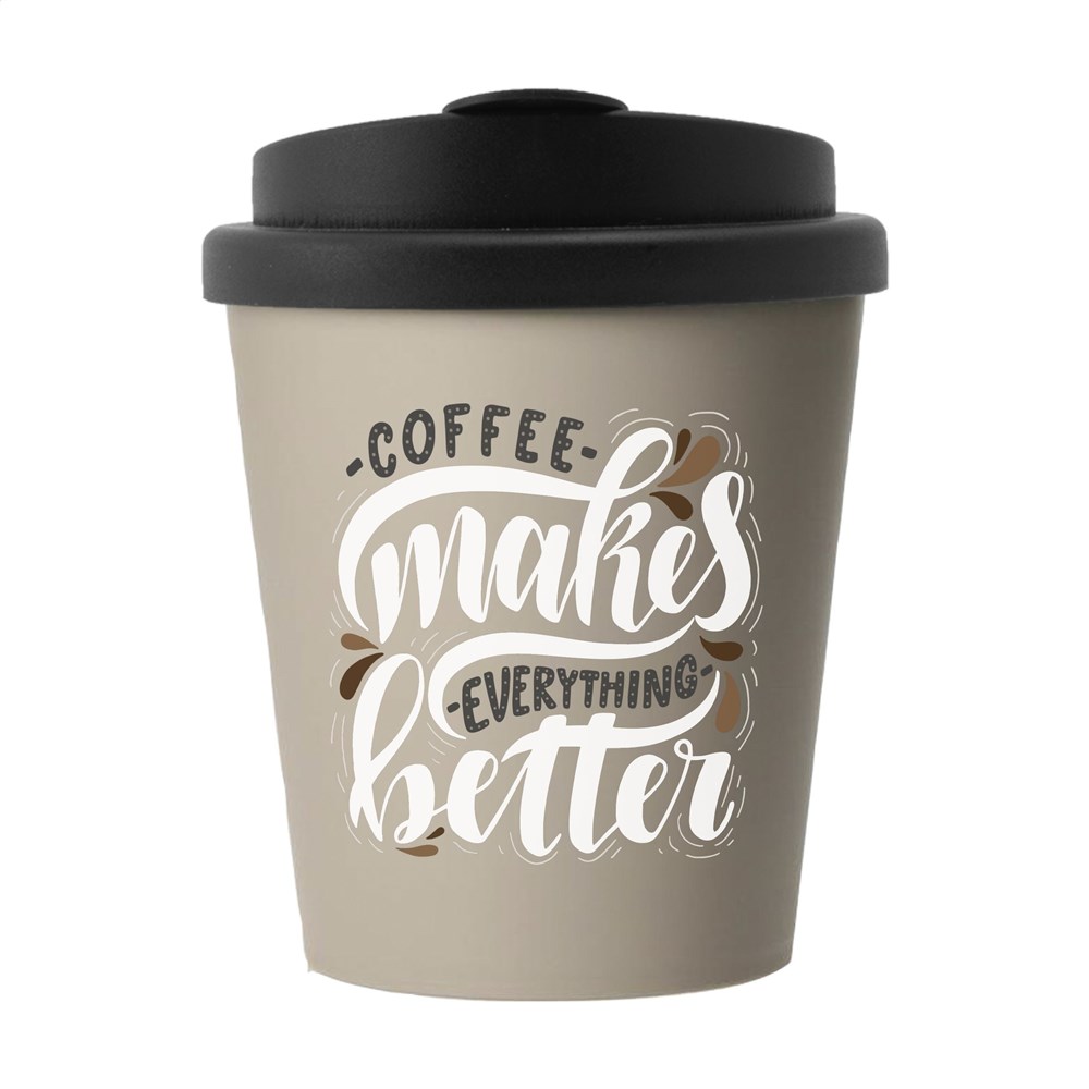 Doppelwandiger Kaffeebecher-to-go. Hergestellt aus 100% recycelbarem, robustem Bio-Kunststoff. Hält heiße oder kalte Getränke auf der richtigen Temperatur. Dieser Becher hat einen Schraubdeckel mit Trinköffnung und integriertem Verschluss. Passt in den Standard-Getränkehalter im Auto und ist somit perfekt für unterwegs. Geeignet für Lebensmittel und geruchs- und geschmacksneutral. Nicht spülmaschinengeeignet. Fassungsvermögen: 250 ml. Made in Germany.