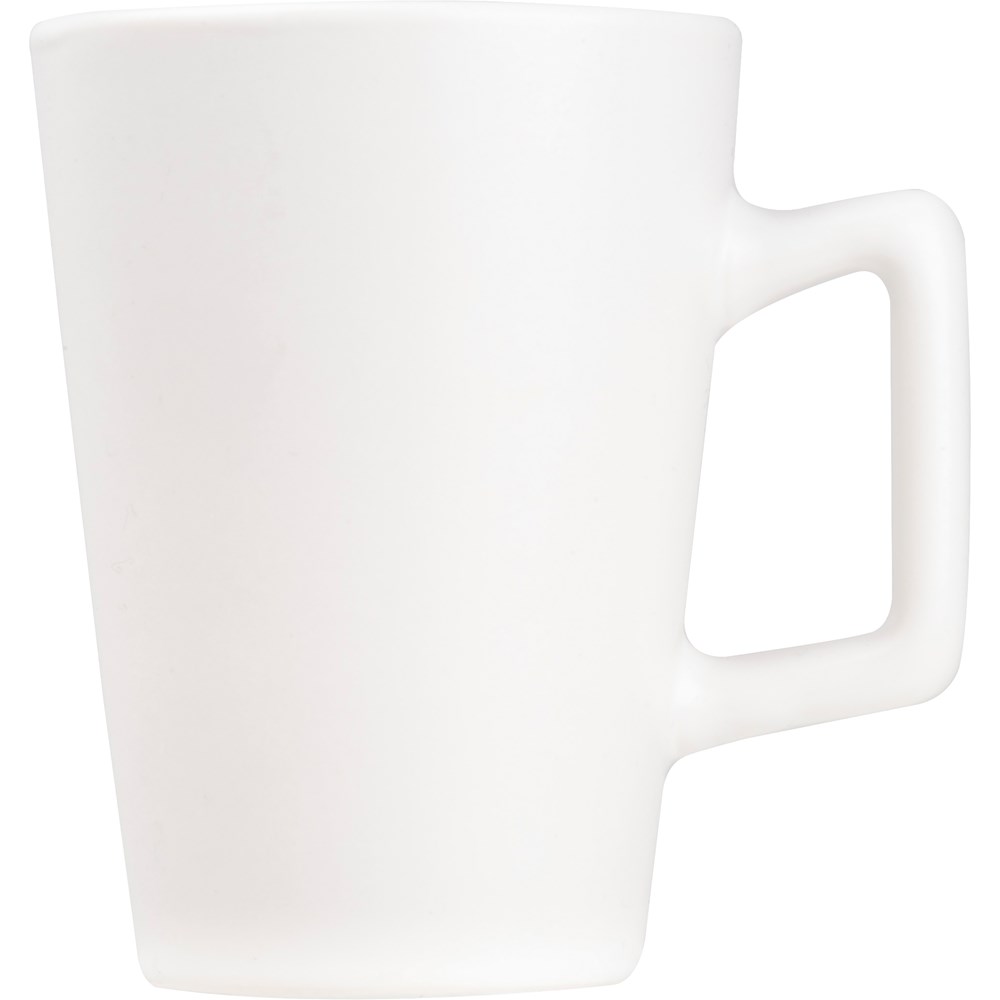 Espresso-Tasse (50ml) aus Keramik mit mattweißer Oberfläche und kantigem Henkel für ein modernes Design. Ihr Logo wird neben dem Henkel auf der Tasse platziert.