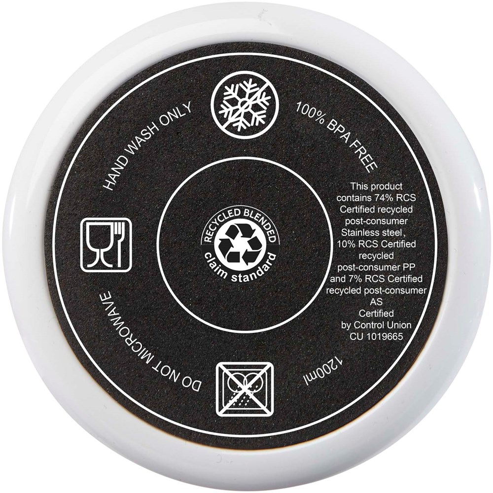 Der Melbourne Becher hat eine doppelwandige Luftisolierung und hält Getränke bis zu 2 Stunden heiß und bis zu 4 Stunden kalt. Die Innenwand des Bechers besteht aus recyceltem Kunststoff, die Außenwand aus RCS-zertifiziertem, recyceltem Edelstahl. Der Becher hat ein Fassungsvermögen von 1.200 ml, damit Sie den ganzen Tag lang stilvoll mit Flüssigkeit versorgt sind. Mit spritzwassergeschütztem Druckdeckel mit zwei Öffnungen und Drehverschluss. Mit lebensmittelechtem und recyceltem Trinkhalm. Nur von Hand reinigen.