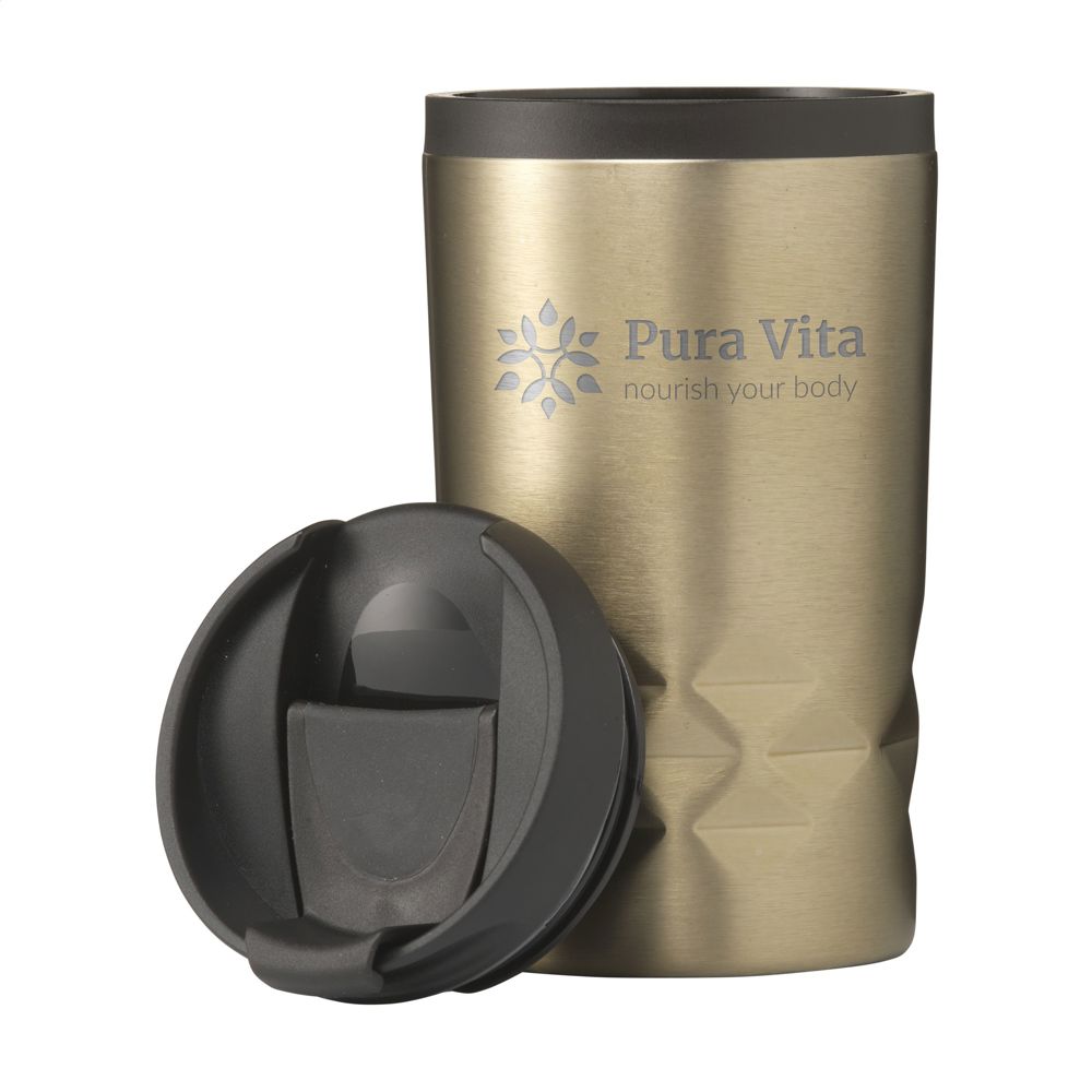 Doppelwandiger Thermobecher aus recyceltem Edelstahl. Mit Kunststoff-Innenwand und Schraubdeckel mit Klicköffnung. Mit auffallendem geometrischem 3D-Rautenmuster im Halter. Rutschfeste Unterseite. Nicht spülmaschinengeeignet. Ohne Deckel hat der Becher eine Höhe von 12,4 cm und passt damit unter fast alle Kaffeemaschinen. RCS-zertifiziert. Gesamtes recyceltes Material: 47%. Fassungsvermögen 250 ml. Edelstahl kann viele Male recycelt werden – die Qualität des Materials bleibt dabei weitgehend erhalten. Durch die Verwendung von recyceltem Edelstahl kommt eine geringere Menge an neuen Rohstoffen zum Einsatz. Das bedeutet weniger Energieverbrauch und weniger Wasserverbrauch. Verpackt pro Stück.
