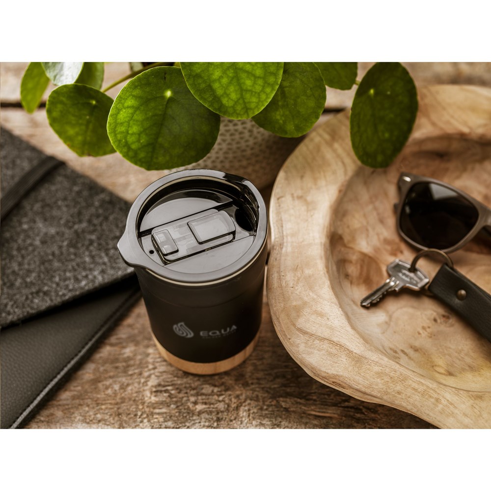 Doppelwandiger Thermobecher mit Außenwand aus recyceltem Edelstahl und PP-Innenwand. Der Becher ist mit einem schwarz-transparenten Aufsteckdeckel mit verschließbarem Trinkloch versehen. Ein auffallend schönes Detail ist die Unterseite aus Bambus mit einer Dicke von 1,5 cm. Nicht spülmaschinengeeignet. RCS-zertifiziert. Gesamtes recyceltes Material: 38%. Fassungsvermögen 350 ml. Edelstahl kann unendlich oft recycelt werden – die Qualität des Materials bleibt dabei erhalten. Durch die Verwendung von recyceltem Edelstahl kommt eine geringere Menge an neuen Rohstoffen zum Einsatz. Das bedeutet weniger Energieverbrauch, weniger Wasserverbrauch und geringere CO2-Emissionen. Verpackt pro Stück.
