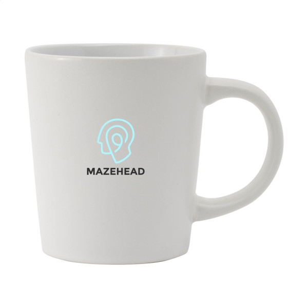 Auffälliger Becher in ansprechendem Design. Aus hochwertiger Keramik gefertigt und mit einer matten Deckschicht versehen. Fassungsvermögen 250 ml. NOTIZ: Der weiße Becher kann nicht mit einer Lasergravur versehen werden, da diese nicht ausreichend sichtbar ist. Der Druck ist spülmaschinengeprüft und zertifiziert: EN 12875-2.