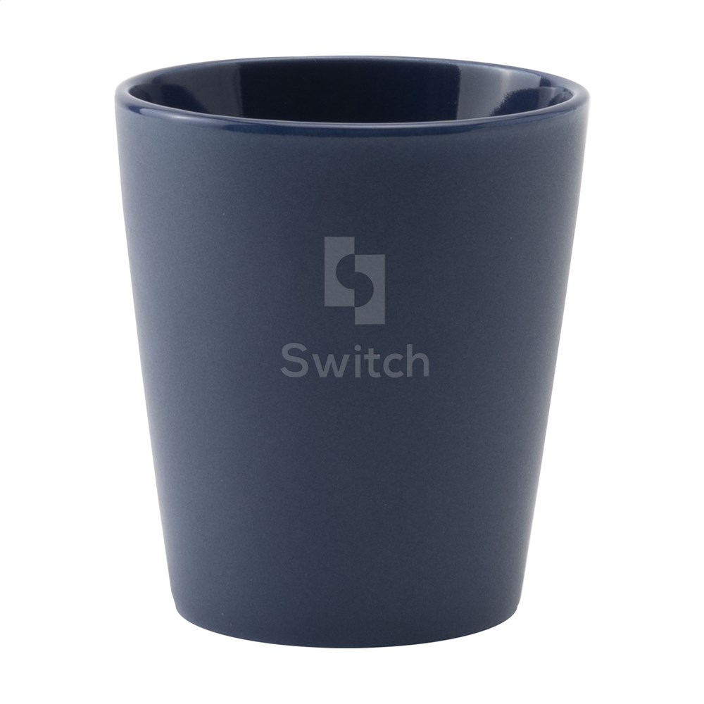 Trendiger Becher ohne Henkel. Aus hochwertiger Keramik. Mit matter, farbiger Außenseite und kontrastierender weißer Hochglanz-Innenseite. Geeignet für alle Kaffeemaschinen. Fassungsvermögen 190 ml. Spülmaschinenfest. Der Druck ist spülmaschinengeprüft und zertifiziert: EN 12875-2.