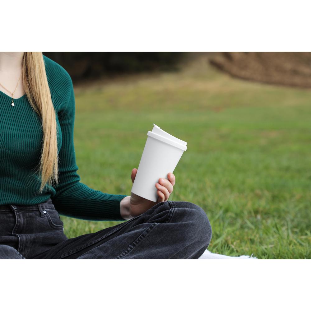 Großzügiger To-Go-Becher aus doppelwandigem Kunststoff inkl. aufsteckbarem Deckel mit Trinköffnung. Der Deckel lässt sich mithilfe der flexiblen Lasche verschließen. Zudem lässt sich diese auch am Deckelrand befestigen. Passt in alle gängigen Getränkehalter in PKW. Füllmenge: 0,35 Liter.