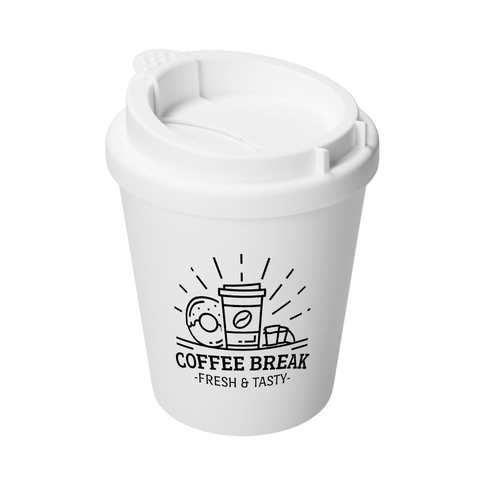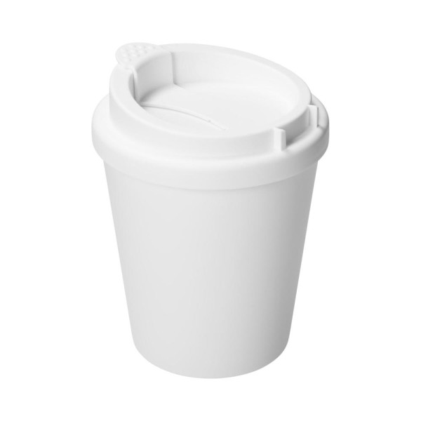 Kompakter To-Go-Becher aus doppelwandigem Kunststoff inkl. aufsteckbarem Deckel mit Trinköffnung. Der Deckel lässt sich mithilfe der flexiblen Lasche verschließen. Zudem lässt sich diese auch am Deckelrand befestigen. Passt in alle gängigen Getränkehalter in PKW. Füllmenge: 0,25 Liter.