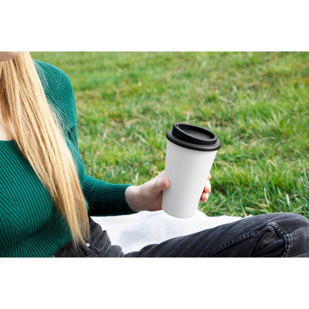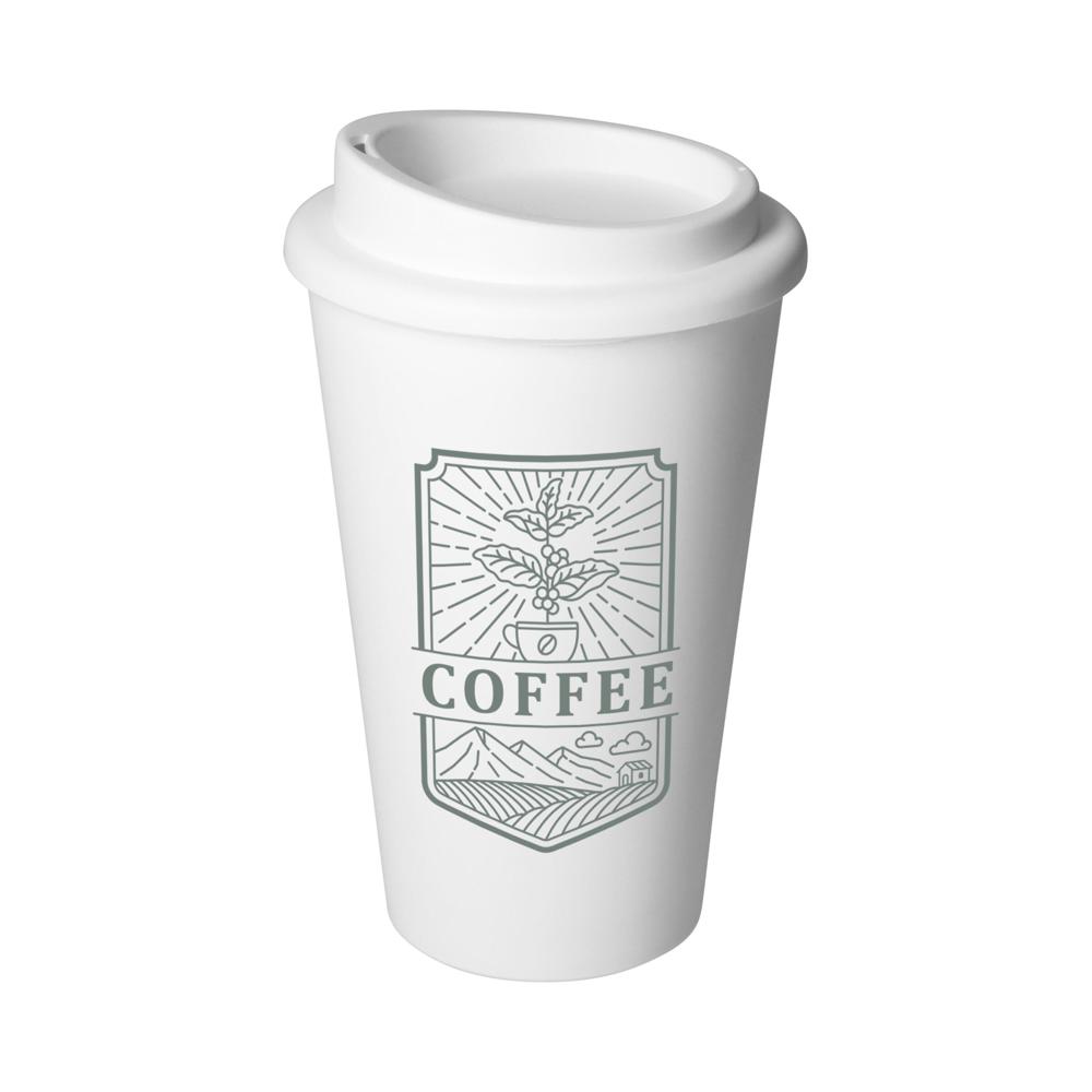 Für den Kaffee unterwegs. Praktischer To-Go-Becher aus doppelwandigem Kunststoff inkl. Deckel mit Trinköffnung. Der Deckel ist verschraubbar und hält somit besonders gut auf dem Becher. Füllmenge: 0,35 Liter.