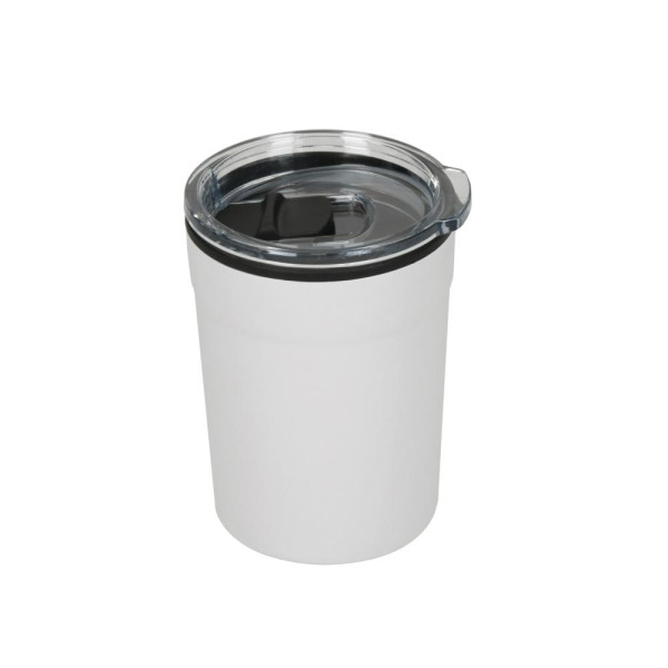 Kleiner, doppelwandiger Kaffeebecher, der unter alle gängigen Kaffeemaschinen passt. Außen aus Edelstahl und mit einem Kunststoffdeckel zum Aufstecken inkl. Verschlussschieber. Füllmenge: 0,15 Liter.
