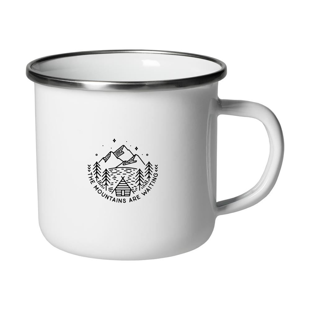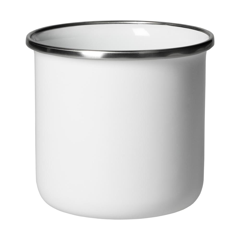 Stylischer Retro-Stahl-Kaffeebecher mit Emaille-Beschichtung und einem Tassenrand aus Edelstahl. Außenfarbe: weiß. Innenfarbe: weiß. Füllmenge: 0,3 Liter.
