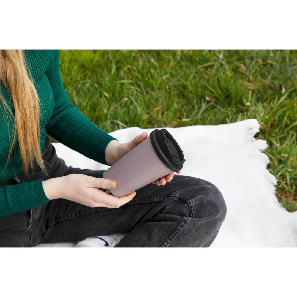 Großzügiger To-Go-Becher aus doppelwandigem Kunststoff inkl. aufsteckbarem Deckel mit Trinköffnung. Der Deckel lässt sich mithilfe der flexiblen Lasche verschließen. Zudem lässt sich diese auch am Deckelrand befestigen. Passt in alle gängigen Getränkehalter in PKW. Aus Bio- Kunststoff gefertigt und in vielen wunderschönen Natur-Farben erhältlich. Füllmenge: 0,35 Liter.