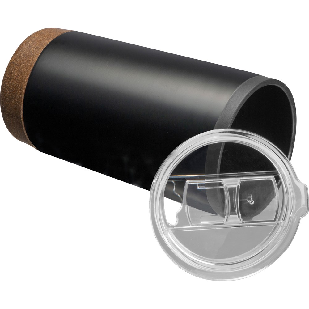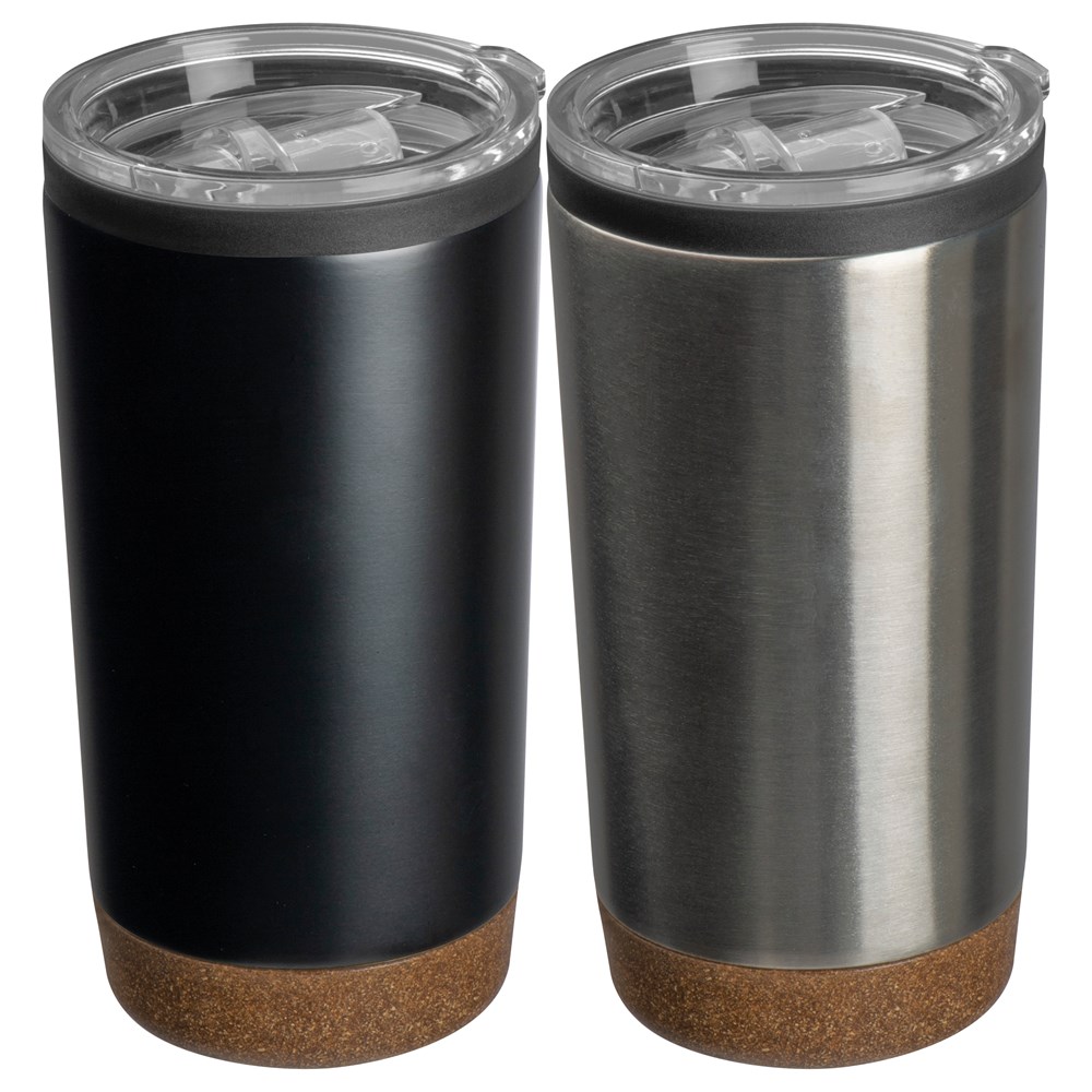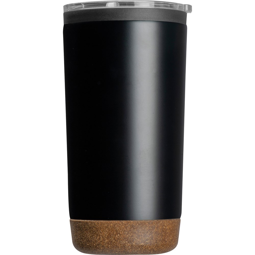 Eleganter doppelwandiger Isolierbecher aus Edelstahl mit 600 ml Fassungsvolumen und schickem Korkboden. Der perfekte Begleiter für Unterwegs. Ihre Werbung lasern wir auf den Becher.