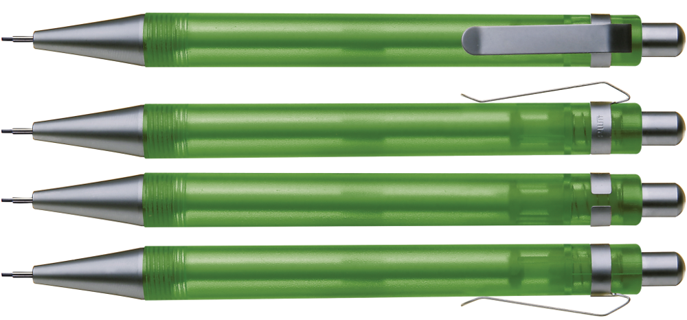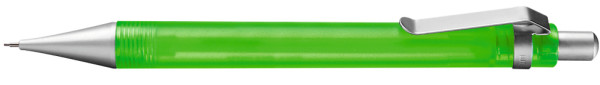 Druckbleistift (0,7mm) mit transparent gefrostetem oder gedecktem Gehäuse. Metalldrücker, Metallclip und Metallspitze matt verchromt.