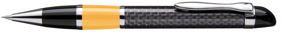 Edler Carbonfaser Metalldrehbleistift (0,7mm) mit farbiger Griffzone, flexiblem Metallclip, Metallzierring und Metallspitze glanzverchromt.