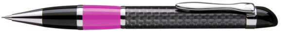 Edler Carbonfaser Metalldrehbleistift (0,7mm) mit farbiger Griffzone, flexiblem Metallclip, Metallzierring und Metallspitze glanzverchromt.