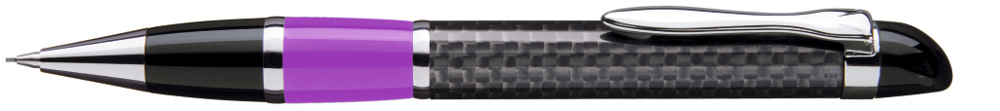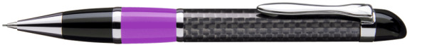 Edler Carbonfaser Metalldrehbleistift (0,7mm) mit farbiger Griffzone, flexiblem Metallclip, Metallzierring und Metallspitze glanzverchromt.