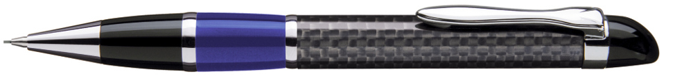 Edler Carbonfaser Metalldrehbleistift (0,7mm) mit farbiger Griffzone, flexiblem Metallclip, Metallzierring und Metallspitze glanzverchromt.