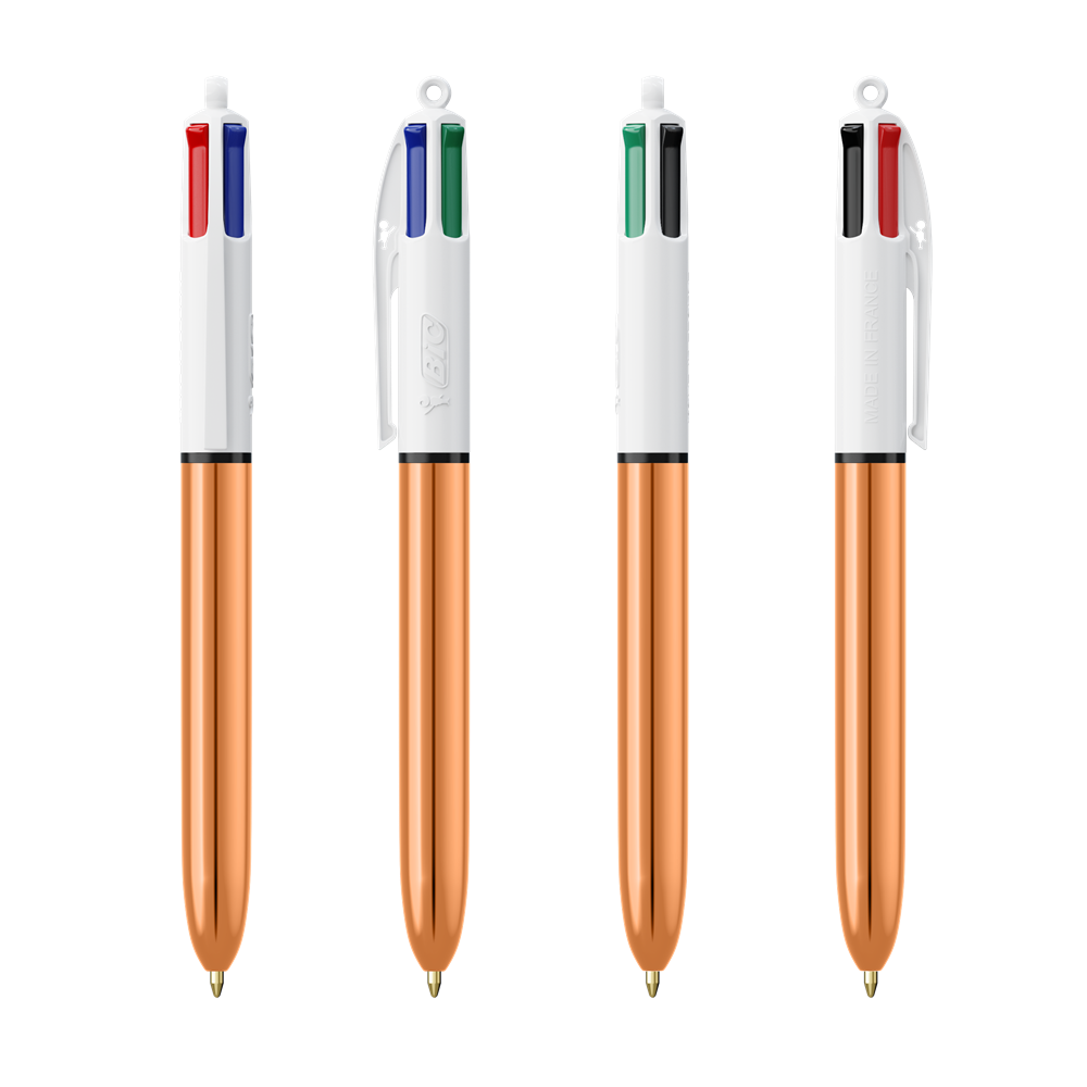 Der BIC® 4 Colours® in glänzenden Metallic-Farben. Enthält vier Standard-Farbtinten: Blau, Schwarz, Rot und Grün. Unser legendärer BIC® 4 Colours® wird nachhaltiger, jetzt mit 13 % weniger Kunststoff im oberen Bereich!