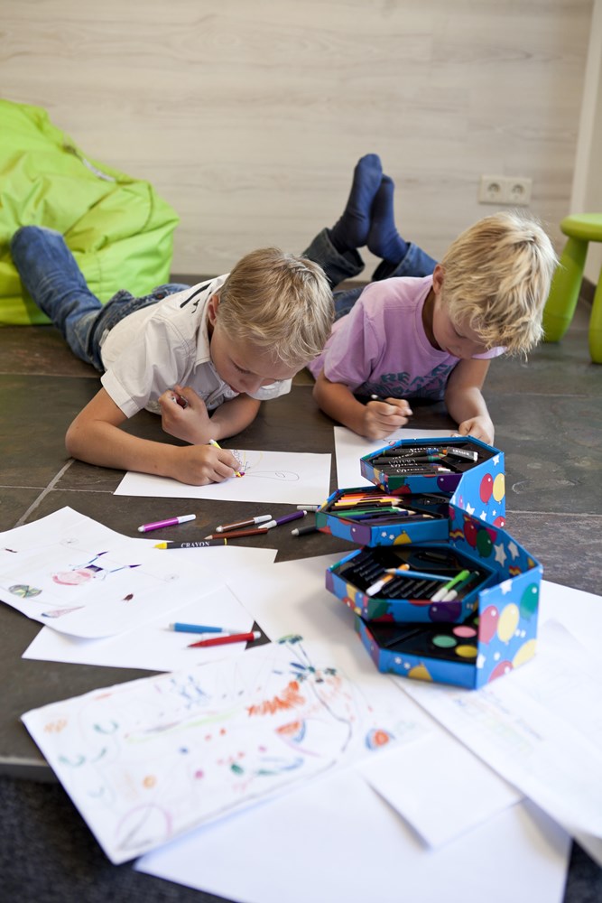 Kinder-Malset in einer Box aus Karton, 56-tlg., bestehend aus Wassermalfarben, Wachsmal-, Bunt- und Filzstiften.