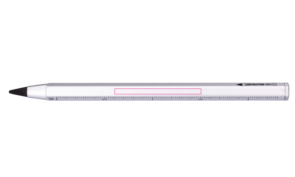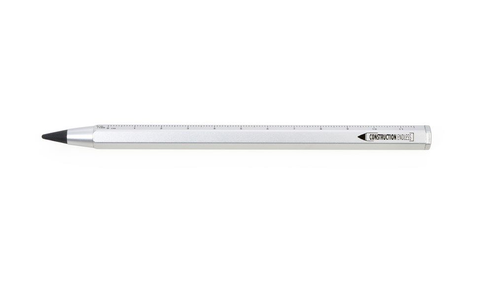 Multitasking-Bleistift mit nachhaltiger Endlos-Schreibspitze (ca. 20km Schreiblänge), HB, radierbar, ohne Anspitzen, Zentimeter-/Zoll-Lineal, 1:20/1:50 Skala, Schreibspitze austauschbar, Aluminium, Metall, matt, silberfarben