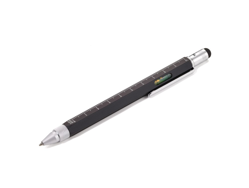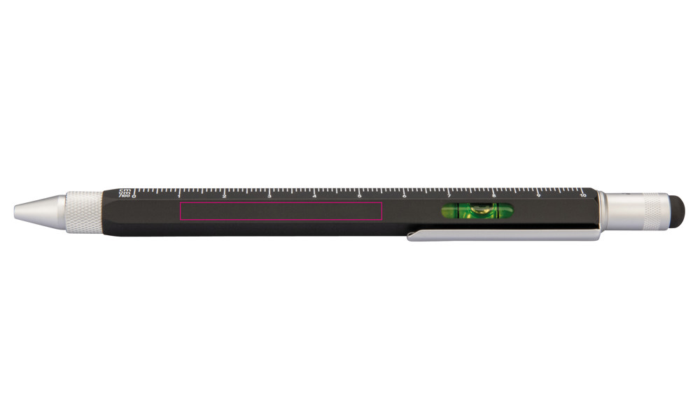 Multitasking-Kugelschreiber, Zentimeter-/Zoll-Lineal, 1:20/1:50 Skala, Wasserwaage, Schlitz-/Kreuzschraubendreher, Stylus, schwarze Mine, Messing, lackiert, matt, schwarz