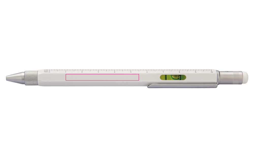 Multitasking-Kugelschreiber, Zentimeter/Zoll-Lineal, 1:20 /1:50 Skala, Wasserwaage, Schlitz-/Kreuzschraubendreher, Stylus, schwarze Mine, Messing, lackiert, silberfarben/weiß