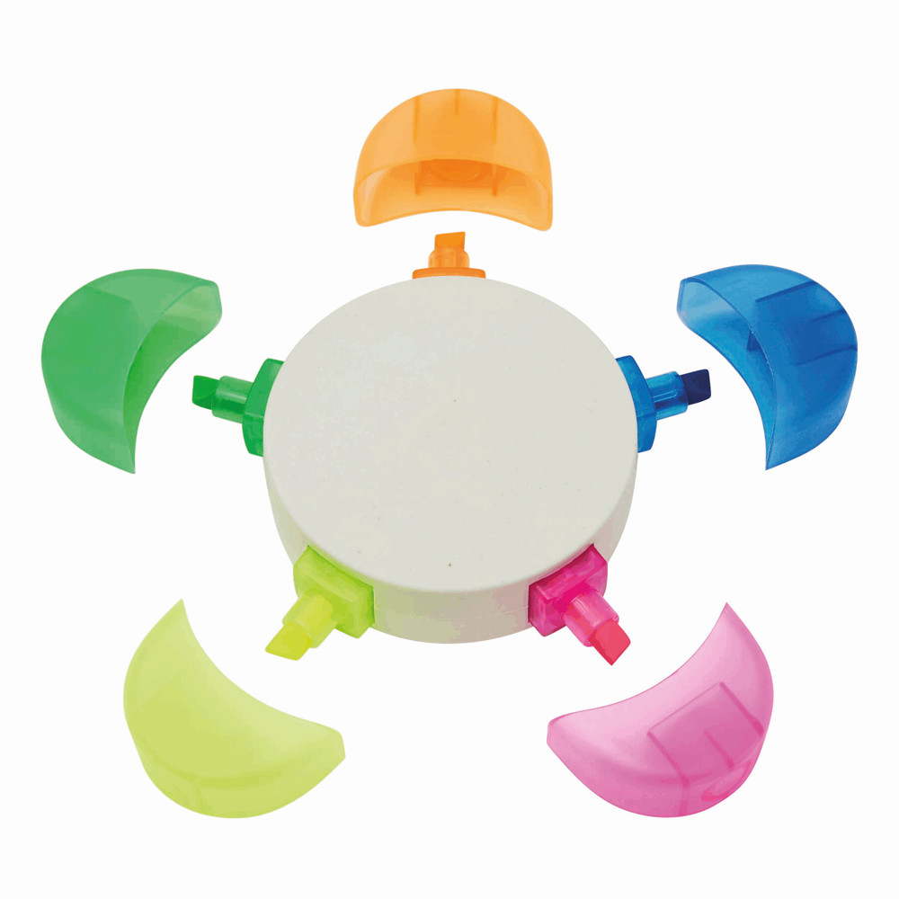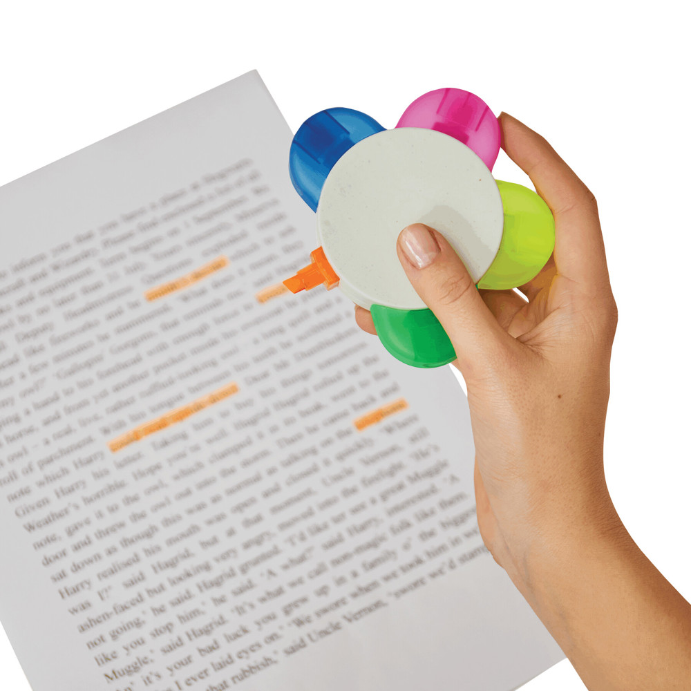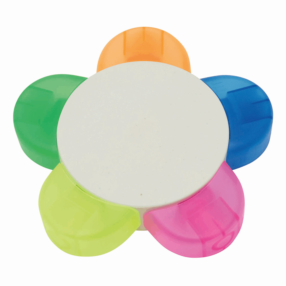 Blumenförmiger Textmarker FLOWER: mit 5 Farben (grün, orange, blau, pink, gelb), zu 30% aus recycelten Milchkartons