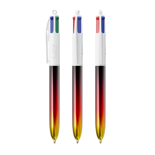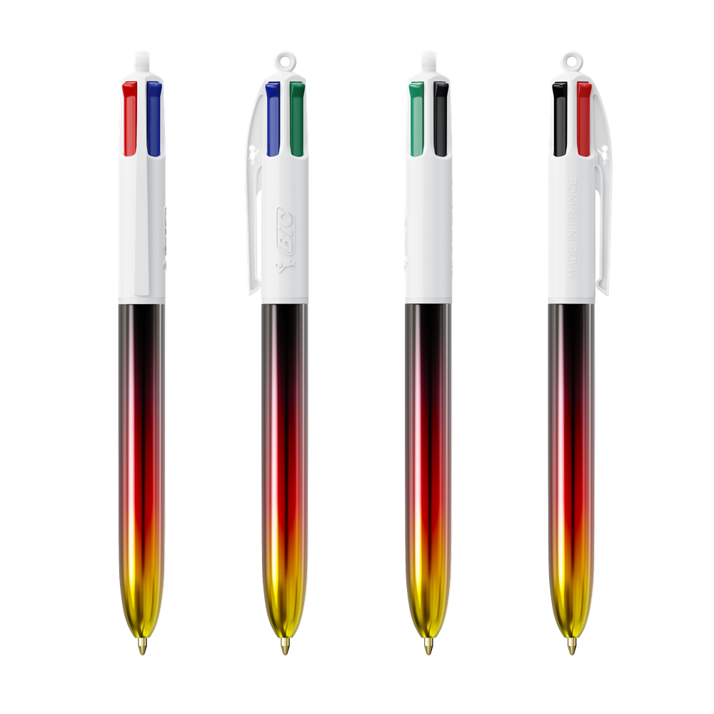 Entdecken Sie unseren BIC® 4 Colours® Flags Collection Kugelschreiber mit metallischem, glänzendem und farbverlaufenden Effekt. Dieses Finish ermöglicht es uns, verschiedene Farbtöne auf dem gleichen Schaft zu mischen. Tauchen Sie ein in unser Farbuniversum! Unser legendärer BIC® 4 Colours ® ist jetzt nachhaltiger, mit 13% weniger Kunststoff im oberen Bereich!