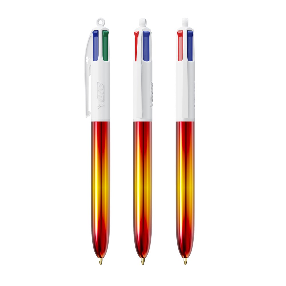 Entdecken Sie unseren BIC® 4 Colours® Flags Collection Kugelschreiber mit metallischem, glänzendem und farbverlaufenden Effekt. Dieses Finish ermöglicht es uns, verschiedene Farbtöne auf dem gleichen Schaft zu mischen. Tauchen Sie ein in unser Farbuniversum! Unser legendärer BIC® 4 Colours ® ist jetzt nachhaltiger, mit 13% weniger Kunststoff im oberen Bereich!