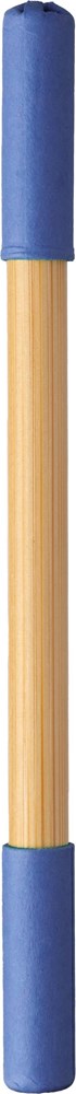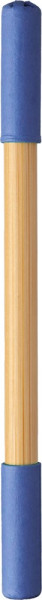 Endloser Bleistift und Kugelschreiber aus Bambus. Eine Seite mit endlosem Bleistift und die andere mit Kugelschreiber, beide mit farbigem Kartondeckel. Blaue Tinte.