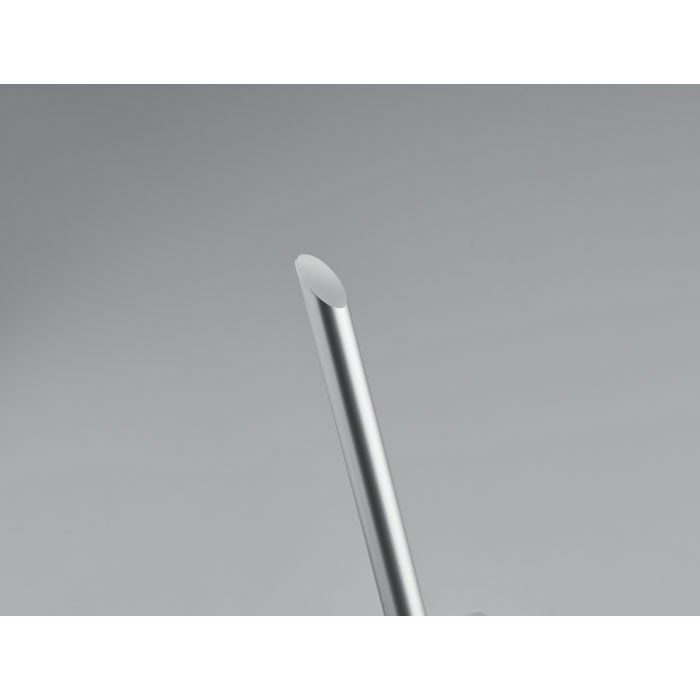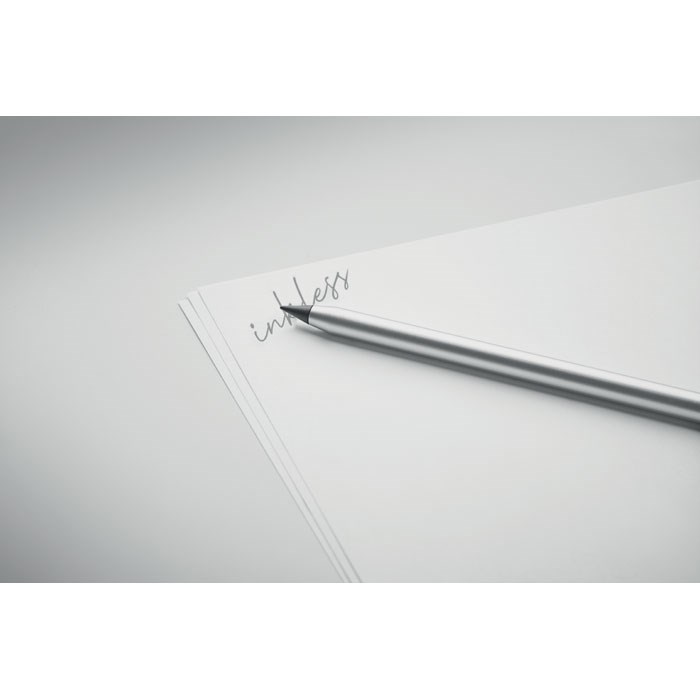 Langlebiger Stift aus recyceltem Aluminium ohne Tinte. Der Stift schreibt mittels Grafitspitze, die durch eine Kunststoffkappe geschützt ist.