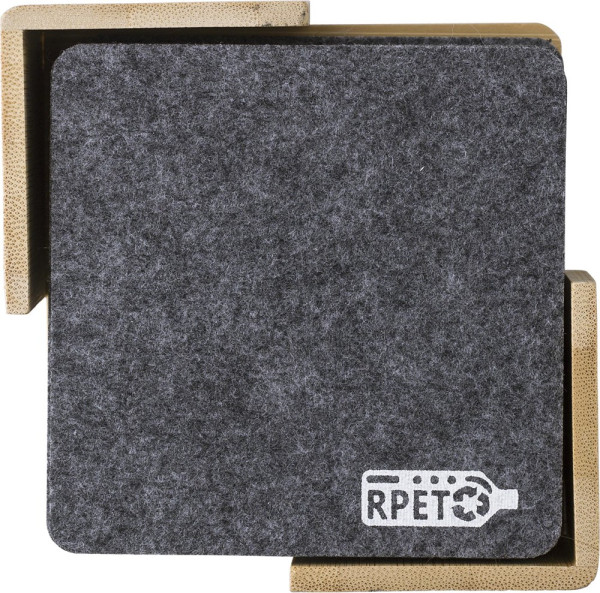 rPET-Filzuntersetzer-Set mit Bambusetui. Das Set enthält zehn Untersetzer mit rPET-Logo. Standardmäßig ist ein bedruckter Untersetzer enthalten, der Druck auf mehreren Untersetzern ist gegen Aufpreis möglich. Das Set ist pro Stück in einem braunen Karton verpackt.
