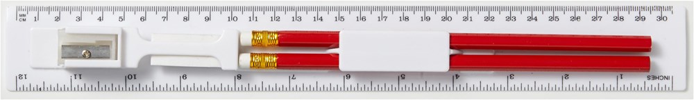 Lineal-Set aus Kunststoff, 5-tlg., inklusive Anspitzer, Radiergummi und zwei Bleistiften.