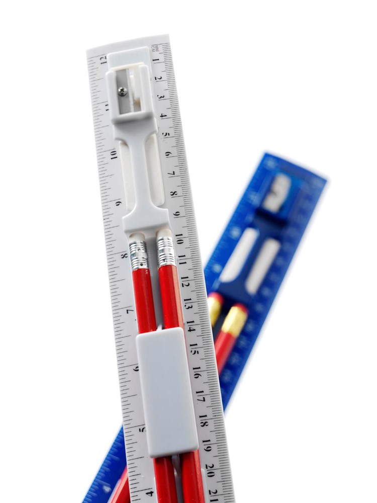 Lineal-Set aus Kunststoff, 5-tlg., inklusive Anspitzer, Radiergummi und zwei Bleistiften. mehr