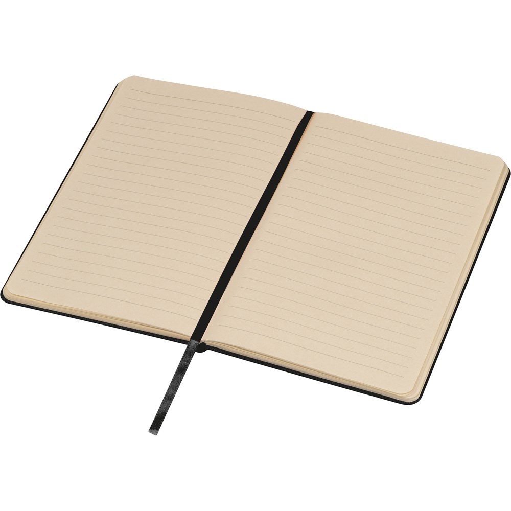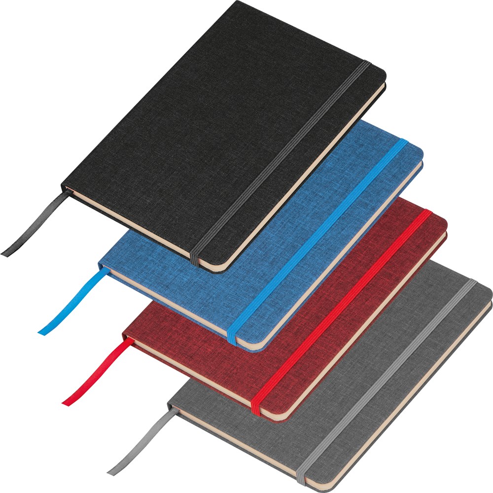Nachhaltiges A5 Notizbuch mit gewebtem Einband aus recyceltem PET und 160 Seiten Zuckerrohrpapier. Weiterhin verfügt es über ein Lesezeichen sowie ein Gummiverschlussband. Ihre Werbung drucken wir vorne auf den Einband.
