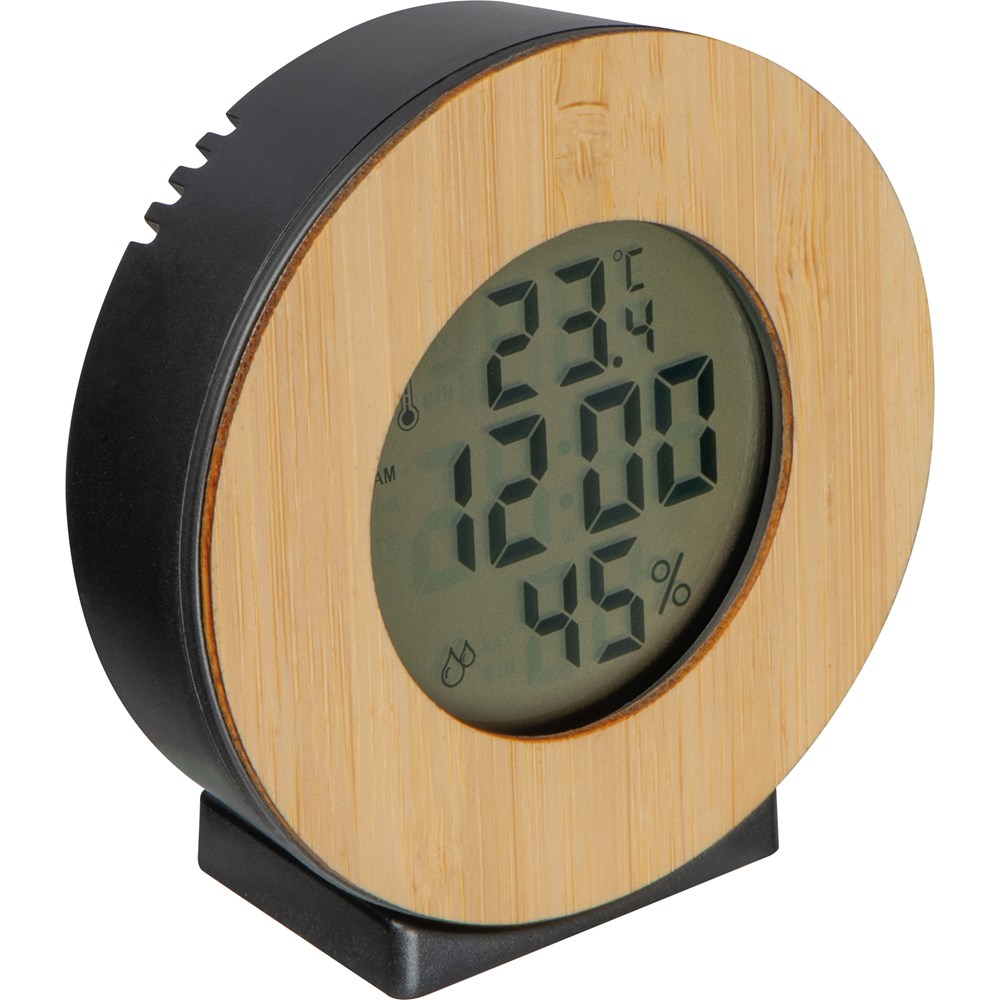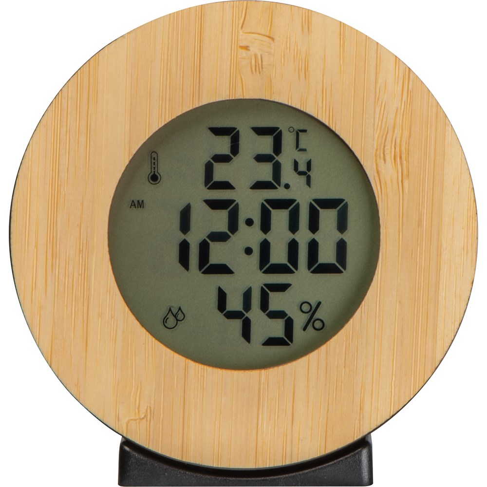 Digitale Wetterstation mit Bambuselement. Sie verfügt neben einer Uhr (12h/24h) noch über eine Alarmfunktion, Thermometer (°C/°F), Hygrometer sowie eine Datumsanzeige. Ihre Werbung gravieren wir auf den Bambusring. Exklusive einer AAA-Batterie, bestellen Sie diese gleich mit (Art. 999400).