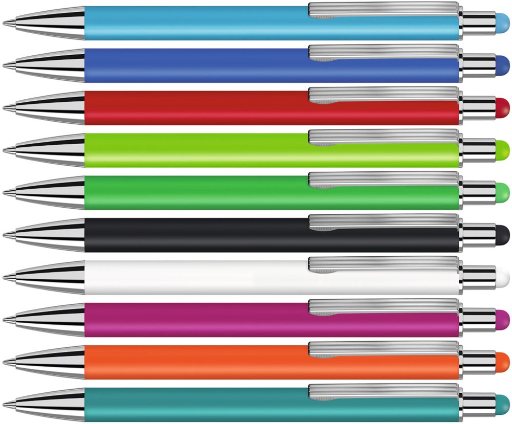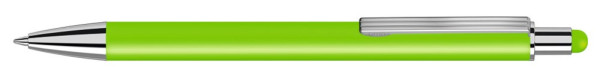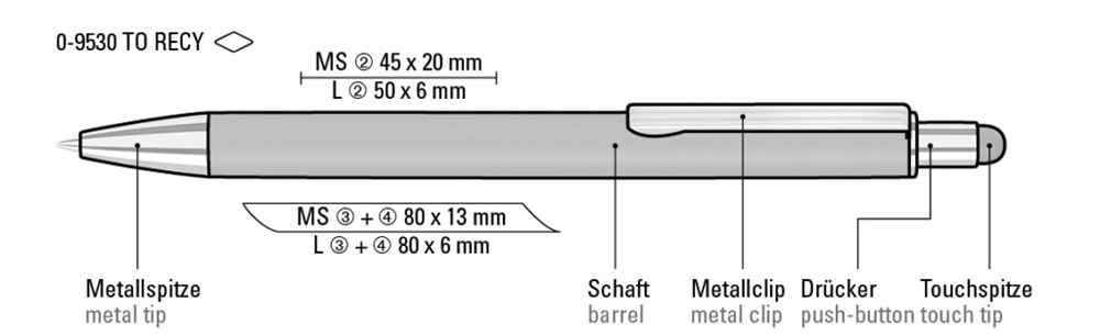 Metall-Druckkugelschreiber mit matter Oberfläche aus recyceltem Aluminium. Metallclip mit eingelassenen Rillen, Metallspitze in silber glänzend und Drücker mit integrierter Touchscreensteuerung.