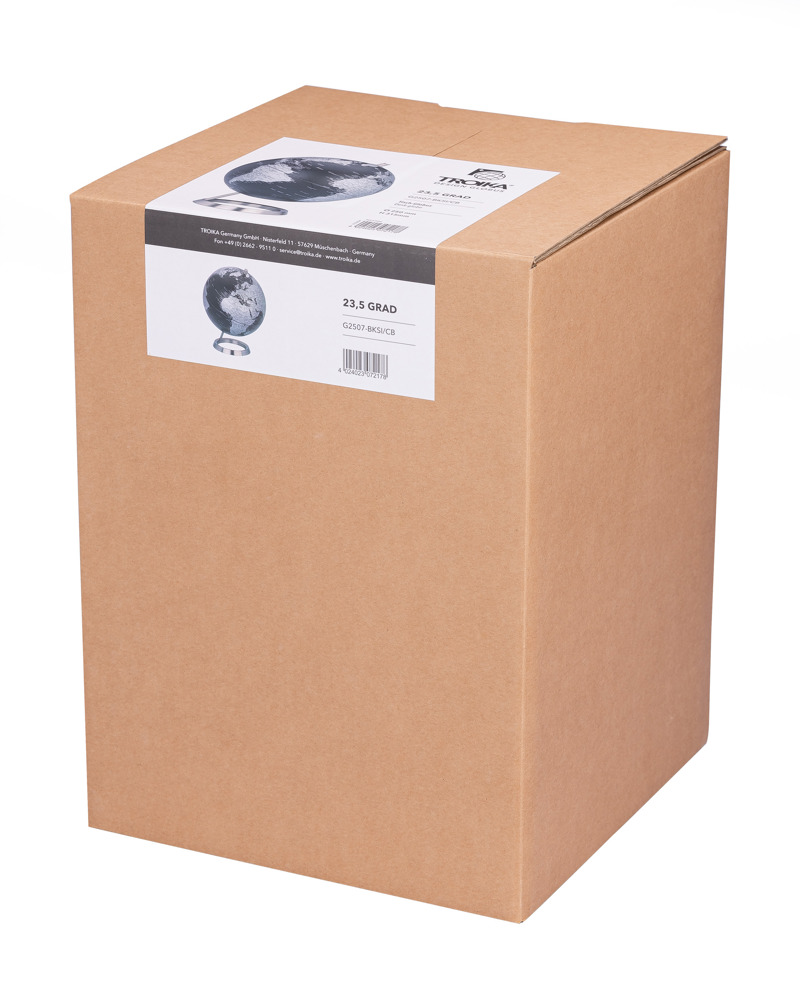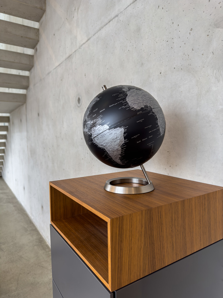 Globus mit 25 cm Durchmesser, verchromter Metallfuß in gebürsteter Optik, 23,5 Grad Neigung an beweglicher Achse, Kartenrelief, Kunststoff, Metall, matt, schwarz/silberfarben