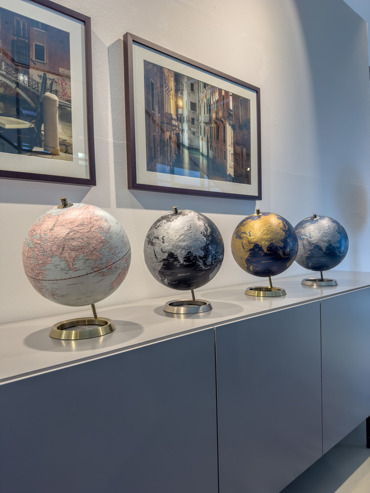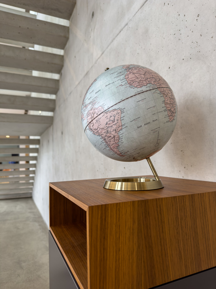 Globus mit 25 cm Durchmesser, verchromter Metallfuß in gebürsteter Optik, 23,5 Grad Neigung an beweglicher Achse, Kartenrelief, Kunststoff, Metall, matt, beige/hellblau