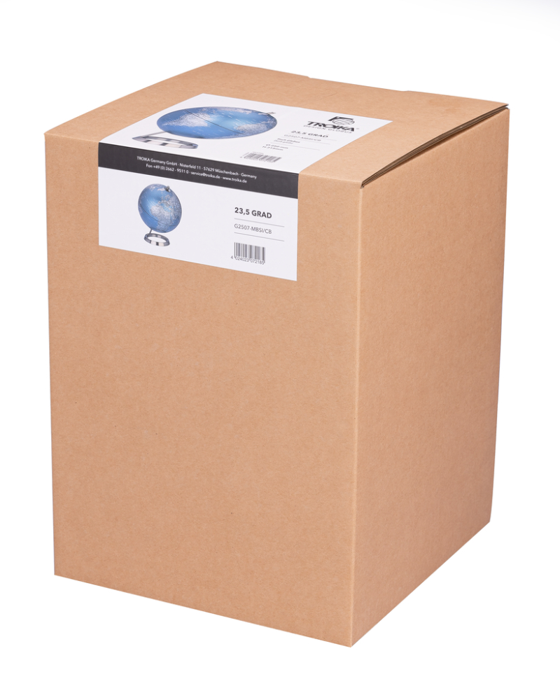 Globus mit 25 cm Durchmesser, verchromter Metallfuß in gebürsteter Optik, 23,5 Grad Neigung an beweglicher Achse, Kartenrelief, Kunststoff, Metall, matt, blau/silberfarben