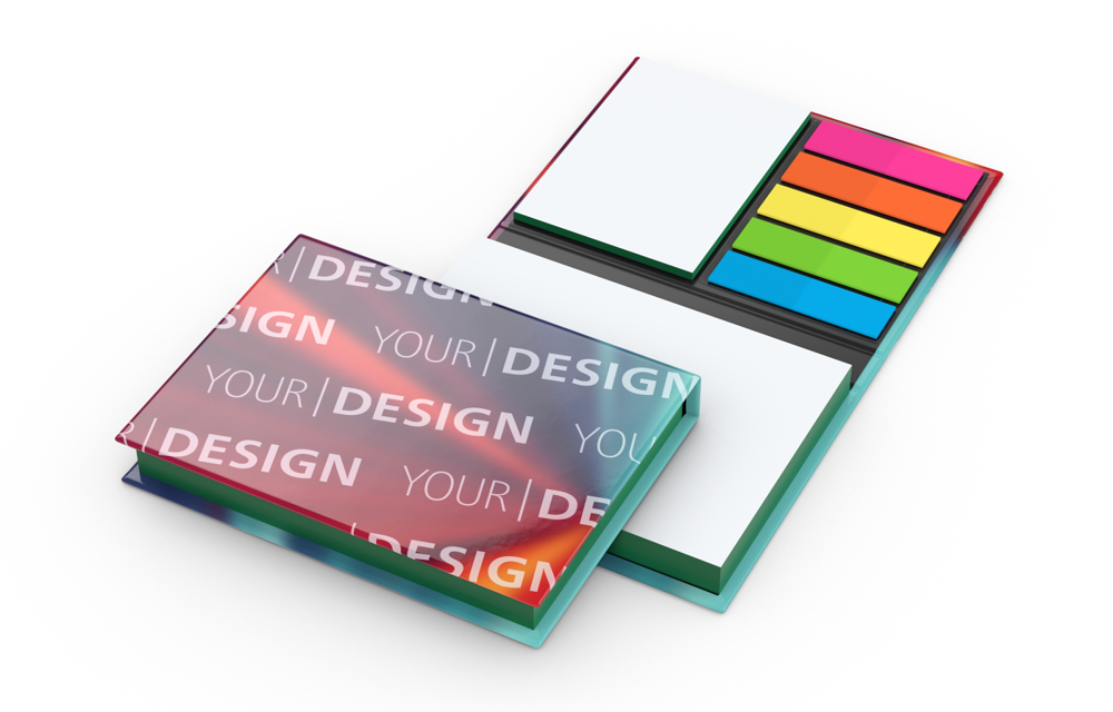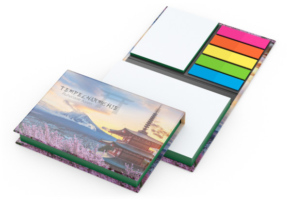 Das Kombi-Set Wien Bestseller mit Farbschnitt kombiniert exklusives Design mit praktischen Funktionen. Mit Farbschnitt, zwei Haftnotiz-Blocks, einem Haftmarker-Set und einem individuell bedruckbaren Umschlag ist es die ideale Wahl für hochwertige und kreative Werbemittel. • Format: 105 × 78 mm geschlossen; 105 × 172 mm offen • Ausstattung: PIegel schwarz; Haftnotiz 100 × 72 mm, 100 Blatt Haftpapier weiß; Haftnotiz 50 × 72 mm, 25 Blatt Haftpapier weiß; Standard-Farbschnitt: Kanten beider Haftnotiz-Blocks farbig; Haftmarker-Set (5 × 20 farbige Marker) • Umschlag: Bookcover individuell • Werbefläche: Umschlag • Druck: 4C-Quality inklusive
