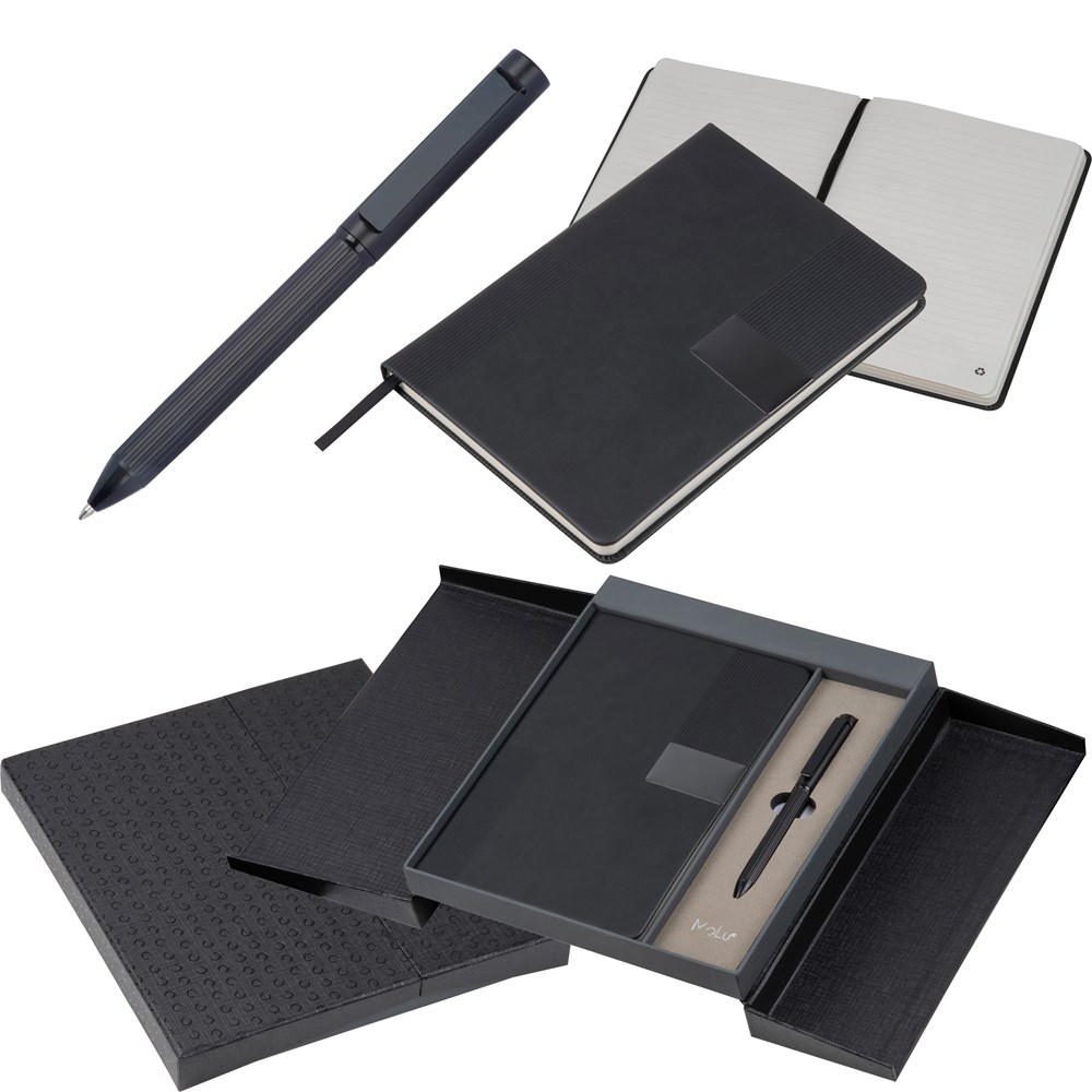Das perfekte Set aus einem blauschreibenden Kugelschreiber aus Edelstahl und Eisen und einem Notizbuch mit 200 Seiten aus recyceltem Papier. Stilvoll und ideal für Büro oder unterwegs. Wir gravieren Ihr Logo auf den Stift und machen dieses Set zu einem persönlichen Highlight!