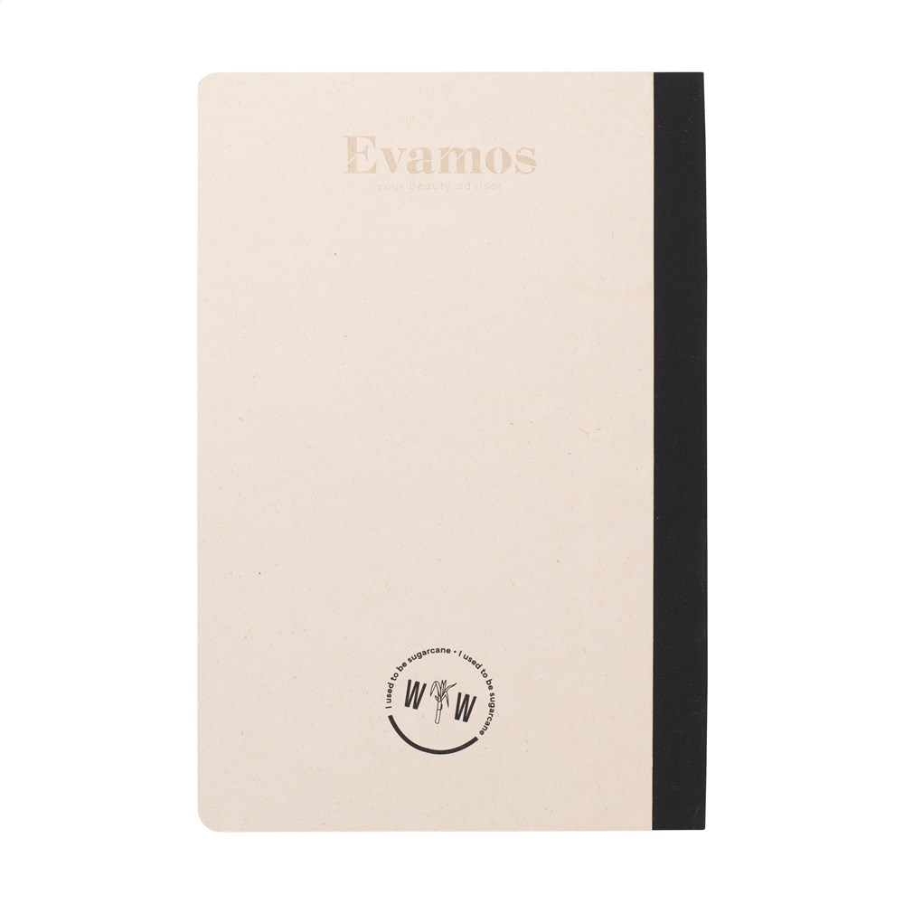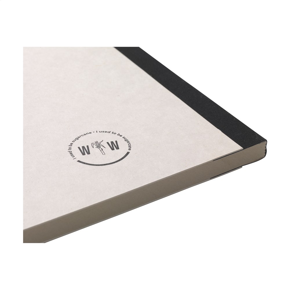 Exklusives Notizbuch im A5-Format, hergestellt aus recycelten Abfällen der Zuckerrohrpflanze. Mit Hardcover und 80 Blatt/160 Seiten liniertem Papier (100 g/m²). Der Einband und das Papier sind FSC Mix zertifiziert. Das Papier, in dem kleine Fasern sichtbar sind, hat eine schöne hellbraune Farbe. Dabei wird Wert auf die Verwendung natürlicher Materialien gelegt. Nach der Ernte verbleiben die Wurzeln der Pflanze im Boden und die Stängel und Blätter werden zu einem Reststoff verarbeitet, der zur Herstellung von Bio-Kunststoff verwendet wird. Eine Zuckerrohrpflanze entzieht der Luft während ihres Wachstums CO2 und kann bis zu 10 Jahre alt werden.