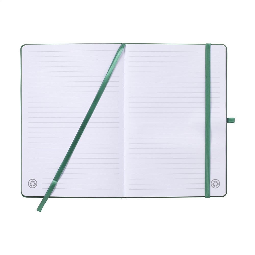 A5-Notizbuch mit Hardcover aus recyceltem PU und ca. 96 Blatt/192 Seiten weißem, liniertem, GRS-zertifiziertem Papier (70 g/m²). Mit gebundenem Rücken, Verschlussgummiband und Seidenleseband. GRS-zertifiziert. Recyceltes Material insgesamt: 93%.