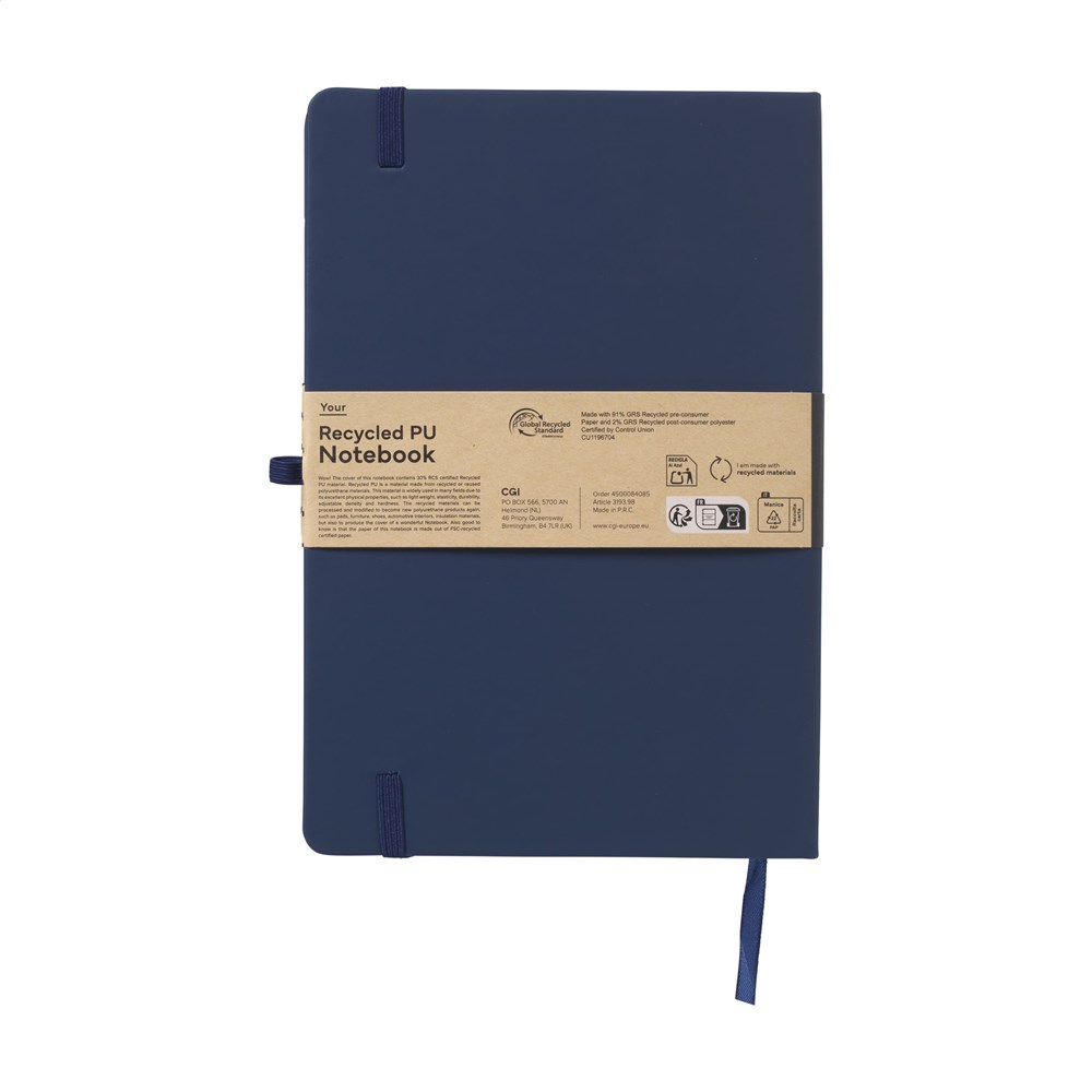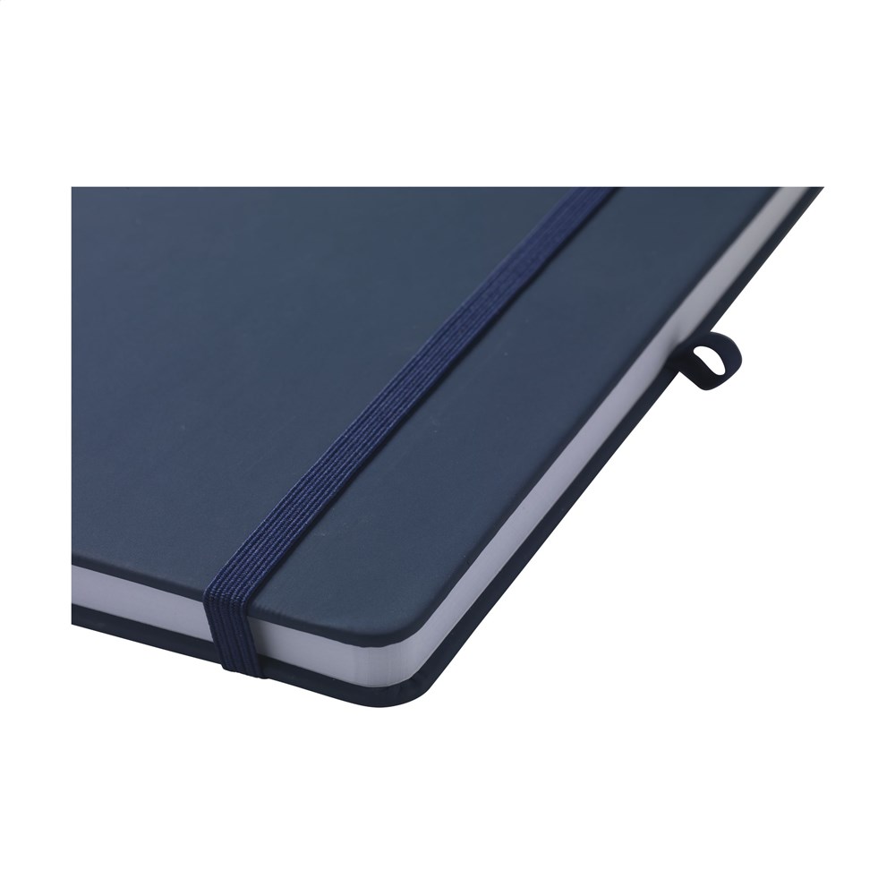 A5-Notizbuch mit Hardcover aus recyceltem PU und ca. 96 Blatt/192 Seiten weißem, liniertem, GRS-zertifiziertem Papier (70 g/m²). Mit gebundenem Rücken, Verschlussgummiband und Seidenleseband. GRS-zertifiziert. Recyceltes Material insgesamt: 93%.