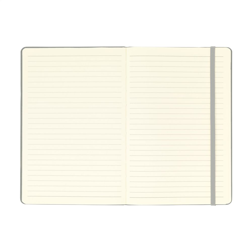 A5-Notizbuch mit Hardcover aus FSC Mix zertifiziertem Karton. Das Notizbuch umfasst ca. 80 Blatt/160 Seiten cremefarbenes, liniertes FSC Mix zertifiziertes Papier (70 g/m²). Mit gebundenem Buchrücken und praktischem Gummiverschluss.